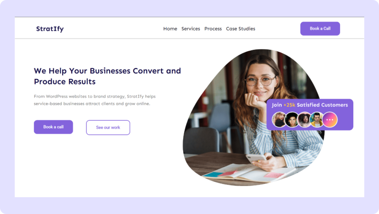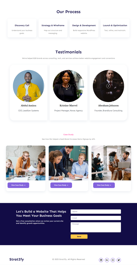 Stratify Stratify is a landing Page that converts leads Project Information The Goal The goal was to create a landing Page that convert business owners and marketing managers looking for professional WordPress design into qualified leads by showcasing StratIfy’s strenths, past Portfolios, and a clear call to book a strategy session